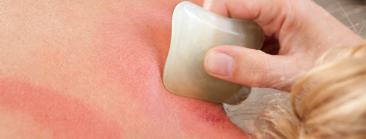 B ei dieser Methode handelt es sich um eine volkstümliche, chinesische Schabetechnik, die stark auf den Blutfluss einwirkt. Mit einem abgerundeten Holzgriff wird in von Stauungen betroffenen Körperarealen solange gerieben bis es zur Bildung von deutlichen Hautrötungen und Petechien kommt. Auch wenn es 2-4 Tage dauert, bis die Zeichen dieser Behandlung verschwunden sind, ist das spontane Gefühl der Erleichterung enorm und es zeigt eine intensive Wirkung auf die Haut, die Lymphe, die Knochengewebe und die inneren Organe. Oft wird es auch zur Narbenverbesserung angewandt.